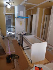 見川町の新築平屋建物(自由設計の注文住宅、ローコスト&ハイクオリティー、認定長期優良住宅、耐震等級3、ガルバリウム鋼板外壁、コンパクトハウス)は昨日、キッチンの組立工事が行われました。